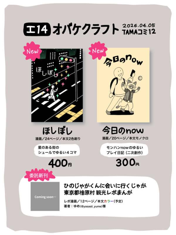 オリジナルの4コマ本とグッズ、モンハンnowの4コマ本が出る予定です。よろしくお願いします。