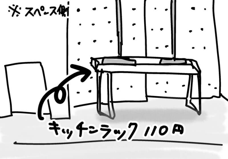 スペース裏面の写真を撮ってなかったのですが、ダイソーのキッチンラックの上にポスタースタンドを載せていました。これがないと机の上に何も置けなかったので持っていってよかったです。