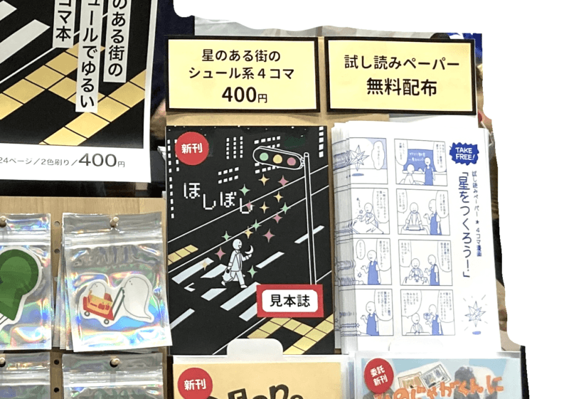 二次創作のイベントでは本のタイトルを値札に記載してましたが、今回は無印良品っぽく内容の「ひとこと要約」を載せるようにしました。効果のほどは不明ですが、ぱっと見でわかりやすくなったかなと思います。